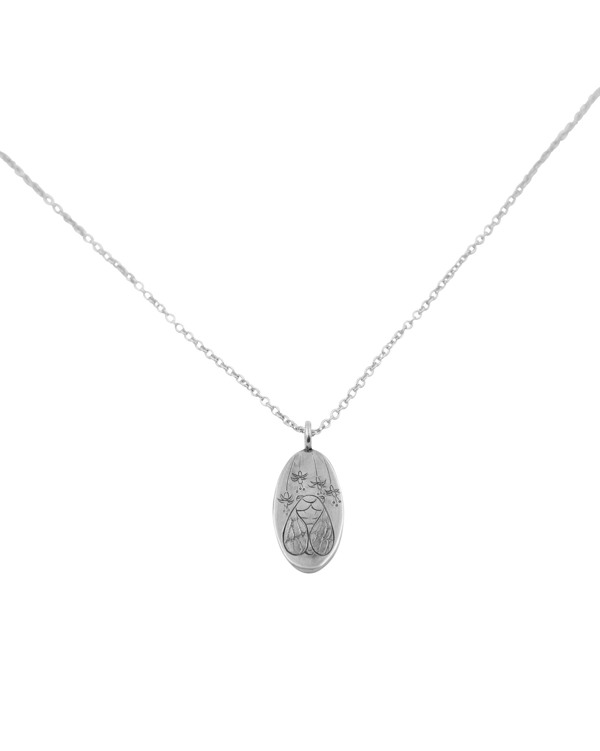 Necklace with pendant engraved with the Moth surrounded by Fuchsia flowers. In the language of flowers it is considered the symbol of grace and loveliness. The moth, on the other hand, represents the truth that you cannot see, because it is a nocturnal insect, and also your passions and the things that give you pleasure. It's that childlike wonder that never seems to go away, no matter the difficulties you've had in life.