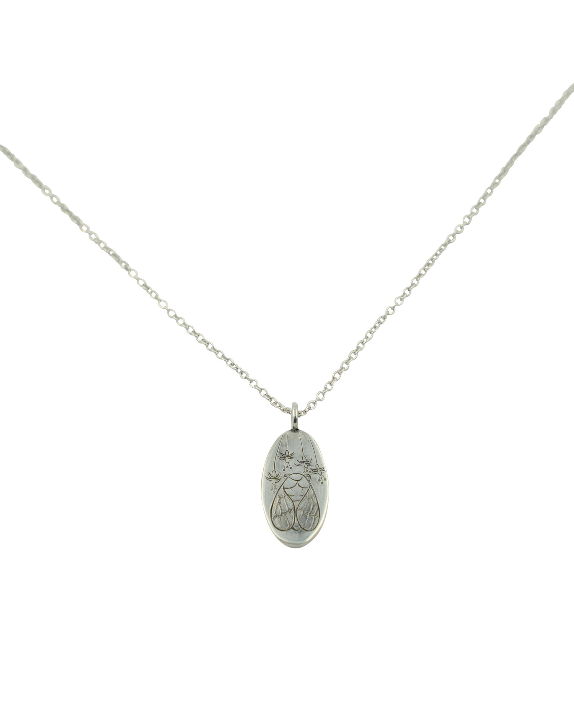 Collana con ciondolo inciso con la Falena circondata da fiori di Fucsia. Nel linguaggio dei fiori è considerata il simbolo della grazia e della leggiadria. La falena invece rappresenta la verità che non puoi vedere, perchè un insetto notturno, e anche le tue passioni e le cose che ti danno piacere. È quella meraviglia infantile che non sembra mai andare via, non importa le difficoltà che hai avuto nella vita.