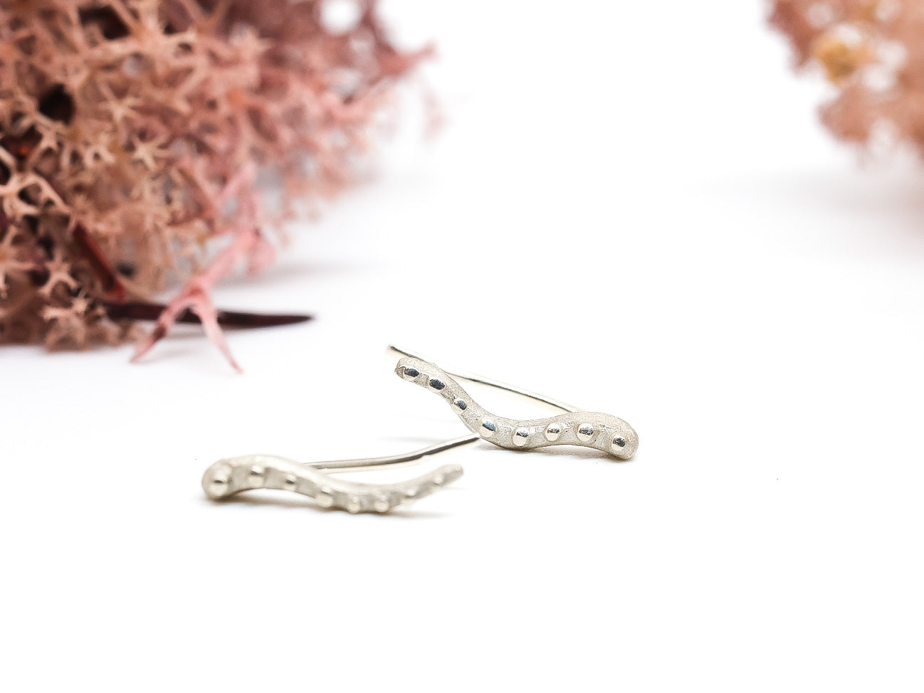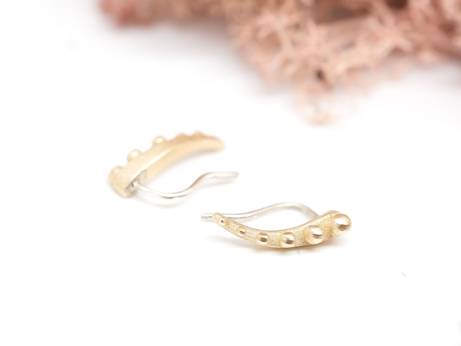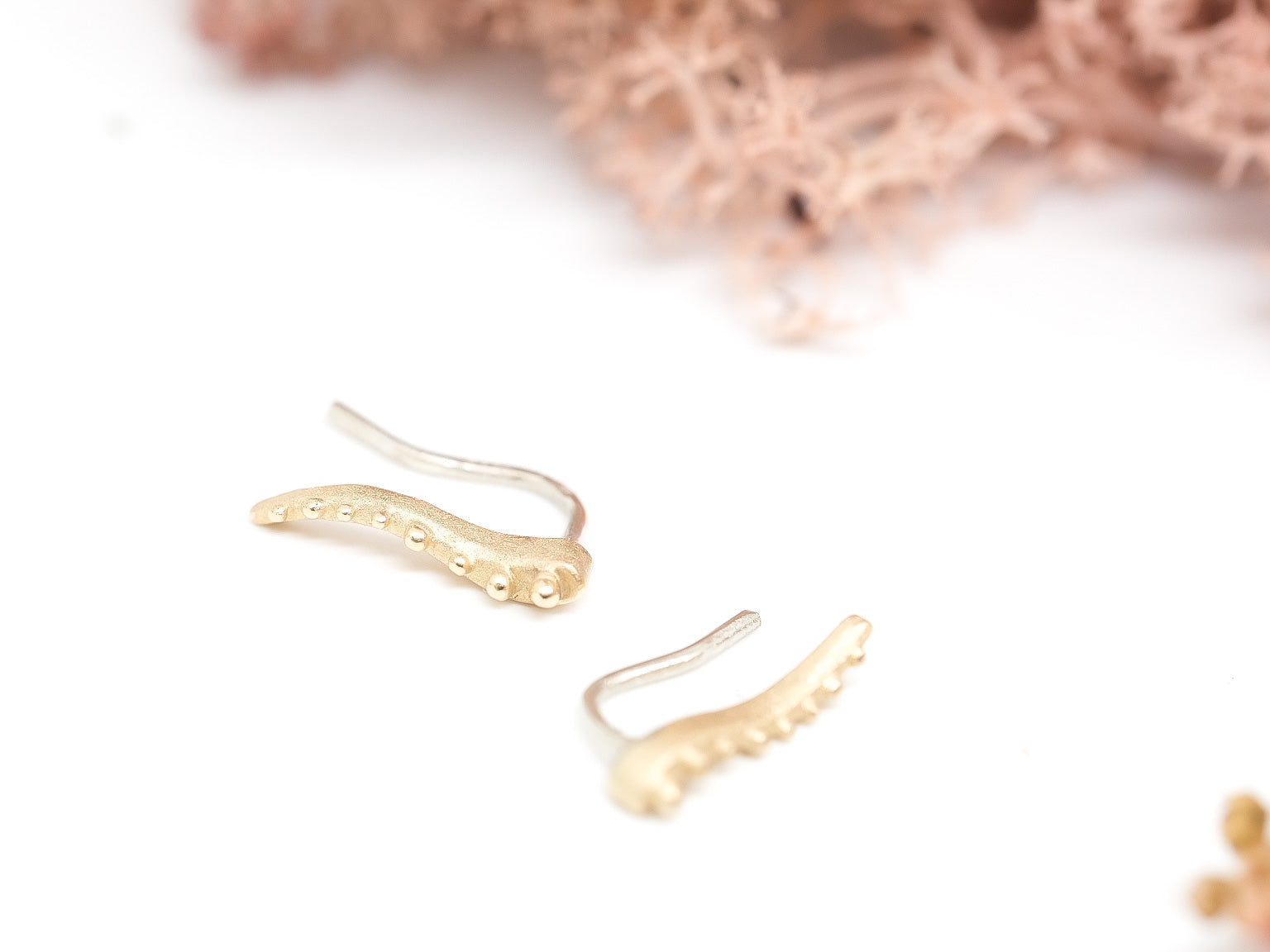 Questi piccolissimi orecchini arrampicatori li ho pensati da secondo buco. Si inseriscono come un orecchini con la monachella poi si girano all’insù e si preme leggermente la parte finale del perno per bloccarli, non necessitano di farfalline o simili.