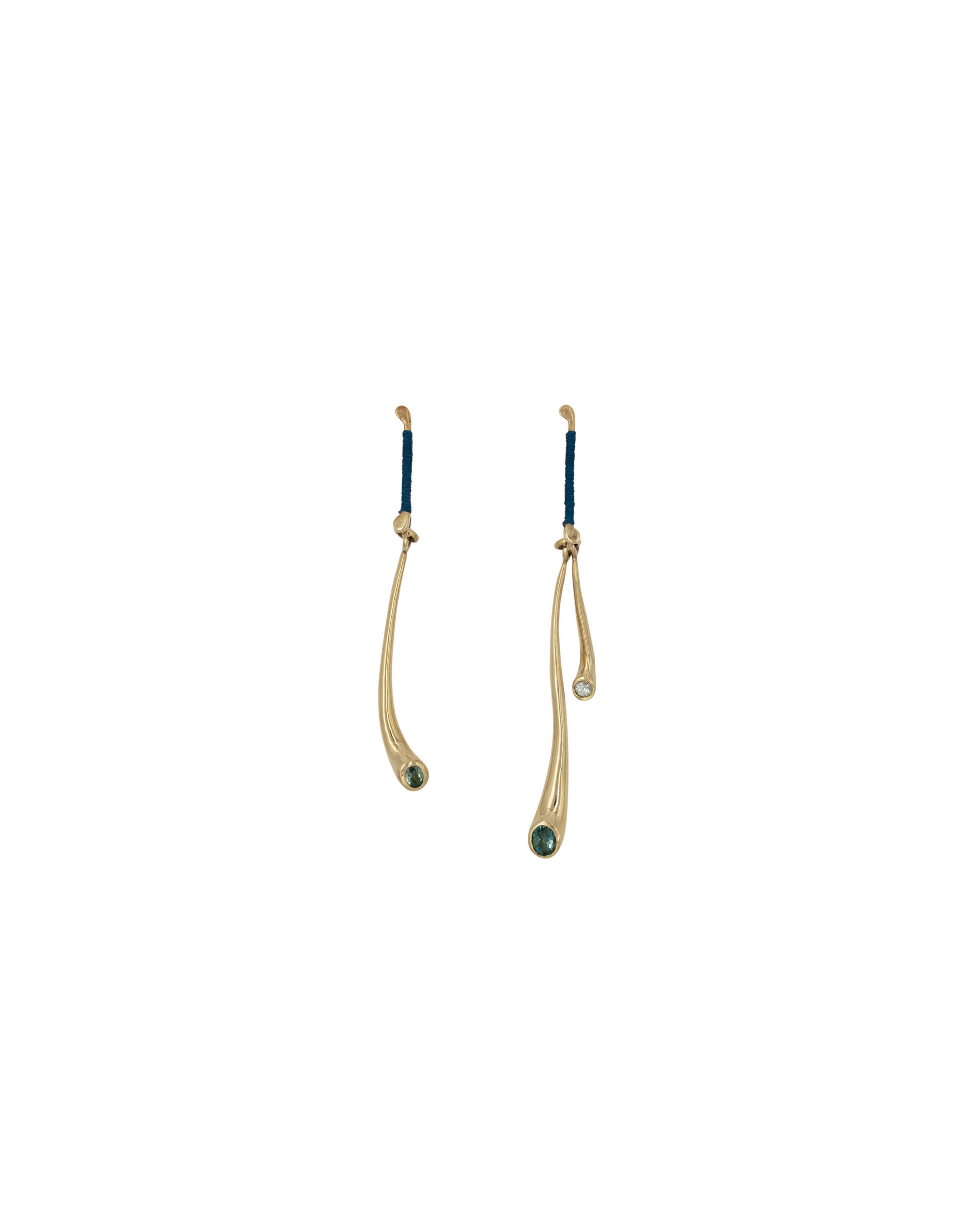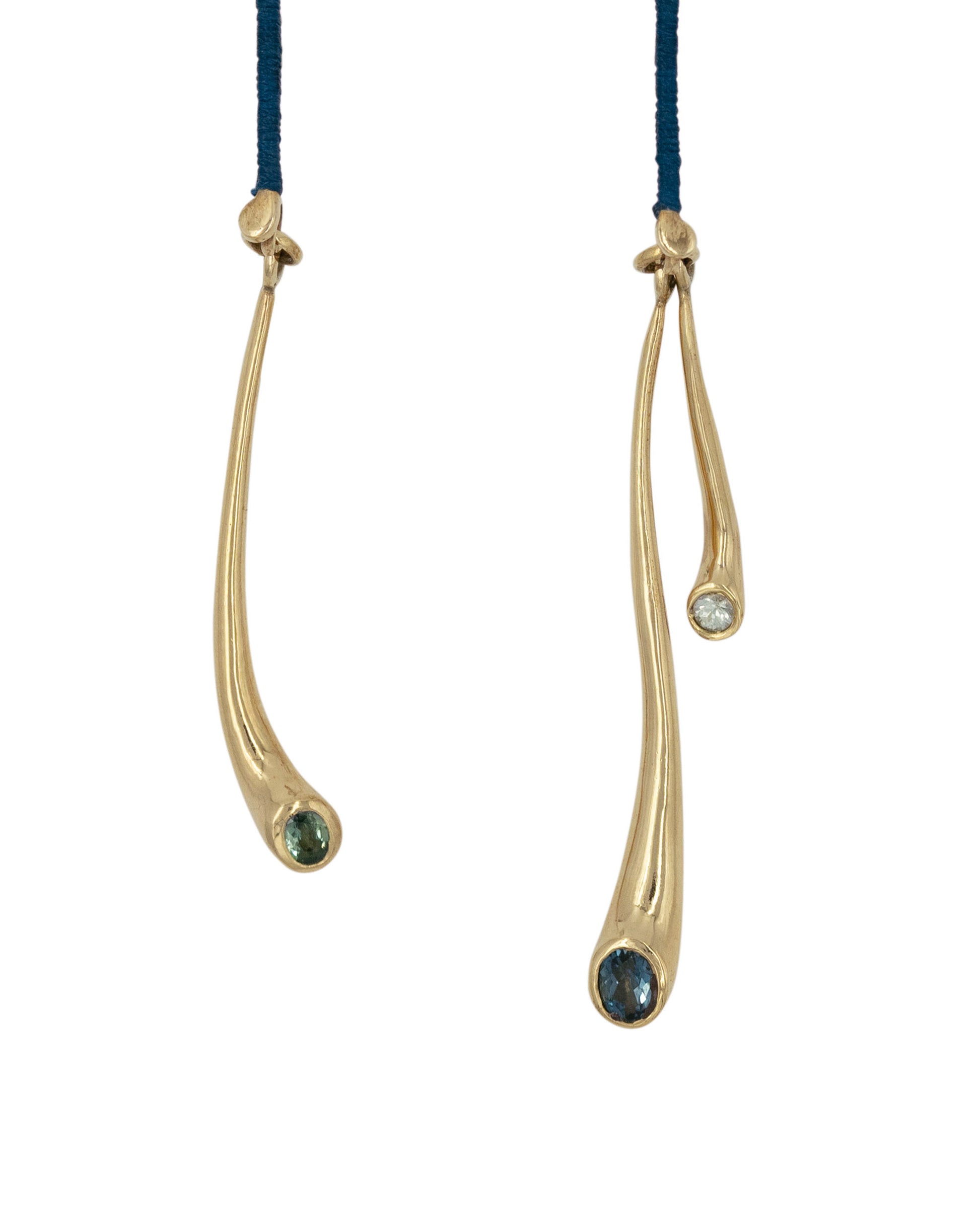 Orecchini asimmetrici in bronzo giallo e argento, con zaffiri blu e lilla. Sono pendenti leggerissimi ed eleganti, la parte vicina al lobo è rivestita di filo di seta reale blu notte.