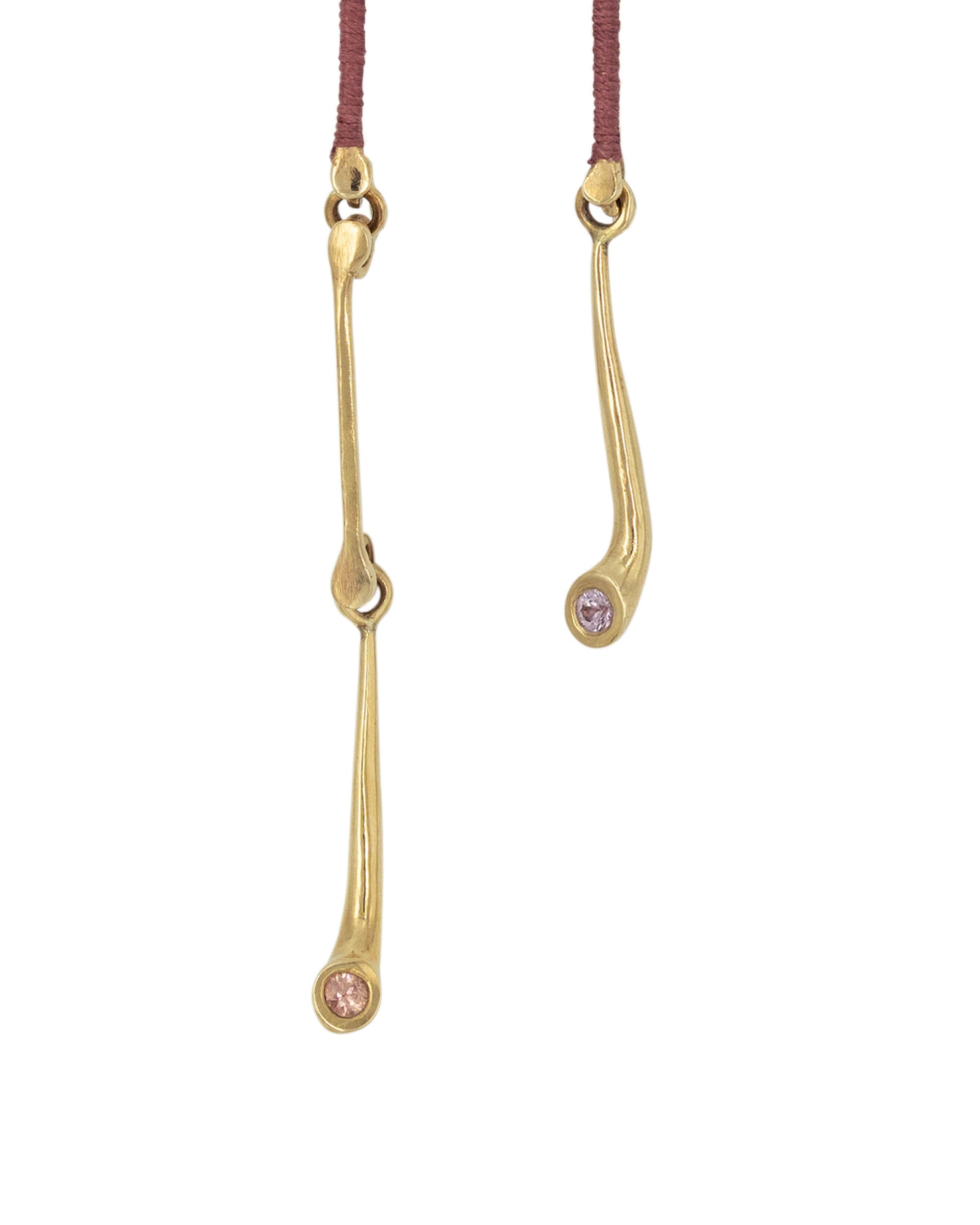 Orecchini asimmetrici in bronzo giallo e argento, con zaffiri rosa. Sono pendenti leggerissimi ed eleganti, la parte vicina al lobo è rivestita di filo di seta reale rosa.